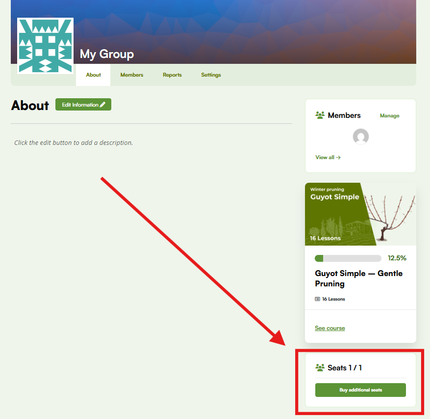 - To buy more seats later on, go to My Groups (link in your account menu) and click on “Buy additional seats“.